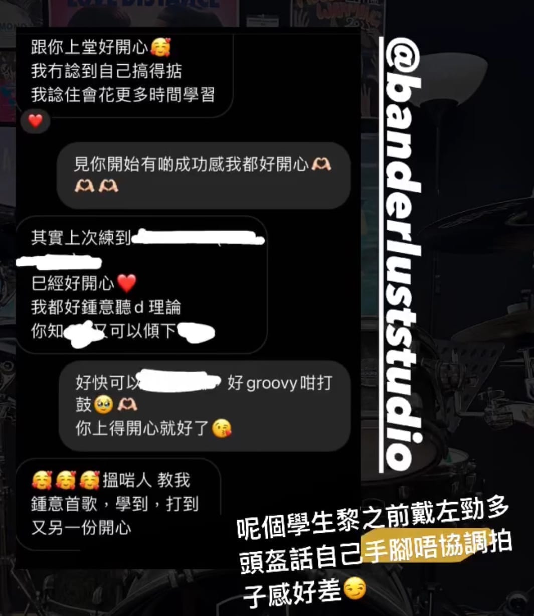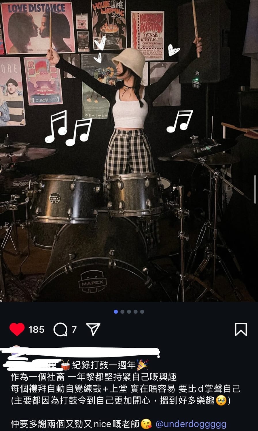 "作為一個社畜 一年黎都堅持緊自己興趣 每個星期自動自覺練鼓+上堂 實在唔容易 主要都因為打鼓令到自己更加開心,搵到好多樂趣 要多謝Miss 每次上堂都好enjoy, 又唔會介意我handicap"