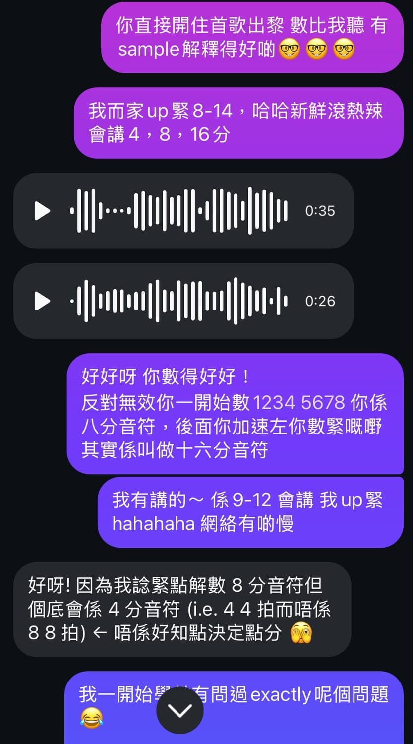 "由睇譜姿勢拍子都勁用心教 我會返去做功課 有時間就練 好感恩 原來我數到拍子嫁 ;'("